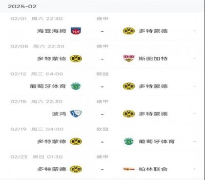 多特2月8日22点30分在德甲主场对阵斯图加特,2月12日4点欧冠淘汰赛附加赛首回合客场对阵葡萄牙体育,2月19日4点次回合主场对阵葡萄牙体育。