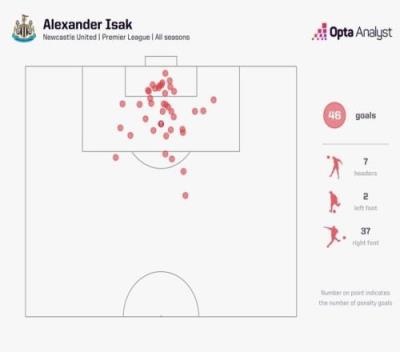 伊萨克为纽卡出场71次英超进46球,队史第3&第1是阿兰希勒148球