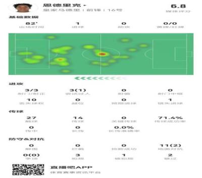 恩德里克本场3射3正进1球+1失良机11对抗2成功+3犯规获评6.8分