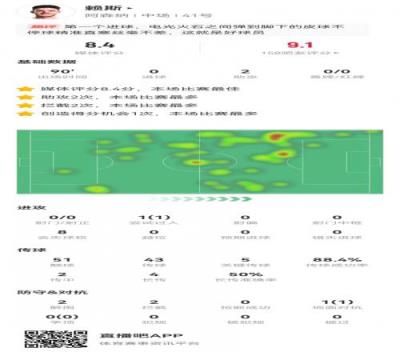 赖斯本场2助攻+5关键传球+2解围2拦截获评8.4分全场最高