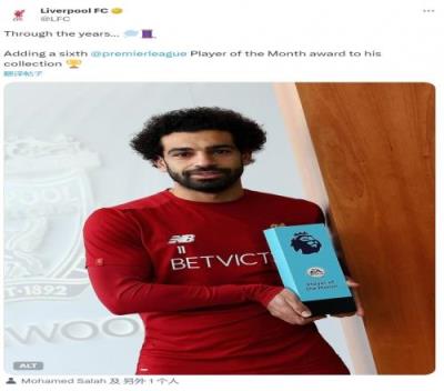 利物浦官方社媒晒出萨拉赫6次获奖的照片,并写道:“历经岁月,第6次获得英超月最佳球员奖项。”