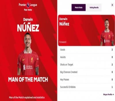 最终,努涅斯获得了最多的投票,当选全场最佳。送出助攻的阿诺德获得18.9%的投票,排在第二。