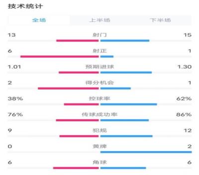 水晶宫11切尔西全场数据:射门1315,射正61,控球率38%62%