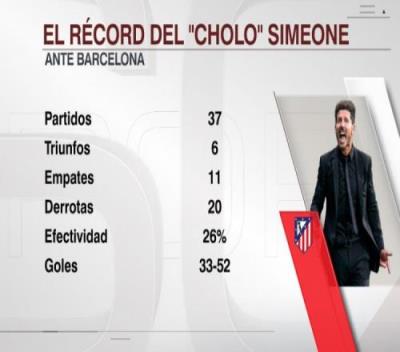 西蒙尼执教生涯37次对阵巴萨,战绩6胜11平20负&进33球丢52球