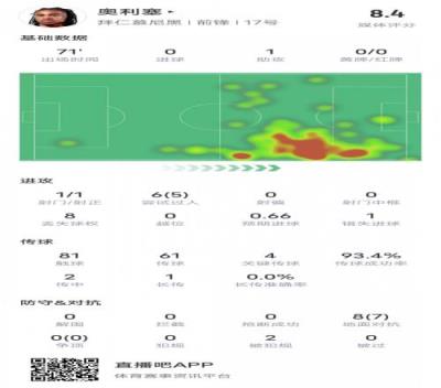 奥利塞本场数据:1助攻5过人成功&传球成功率93.4%,评分8.4