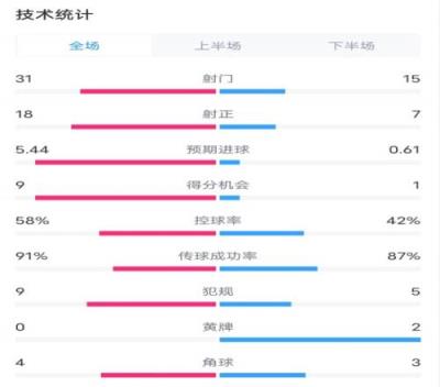 切尔西80诺亚FC数据:射门3115,射正187,控球率58%42%