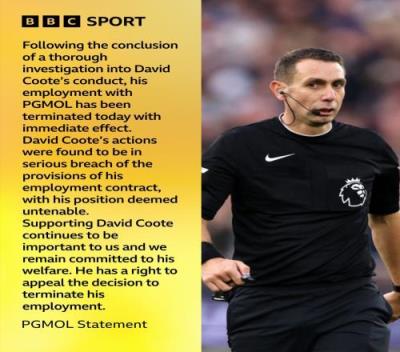 在库特的视频被曝出后,裁判公司就对他进行了停职调查,今天正式宣布将其解雇。