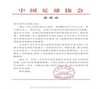 体育资讯1月6日报道宣称 中甲南京城市发文,表示收到了来自中国足协的感谢信。