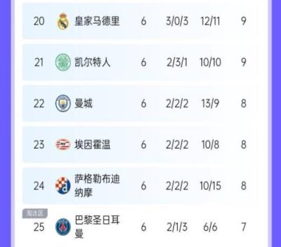 体育资讯12月12日报道宣称 欧冠联赛阶段第6轮,曼城客场0-2不敌尤文,在欧冠积分榜上跌至第22,仅比淘汰区高出一分。