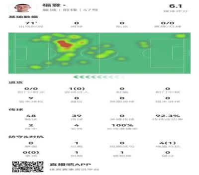 福登本场0射门0关键传球4对抗1成功1失误导致丢球获评6.1分