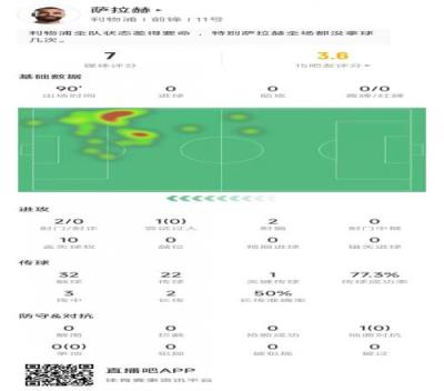 萨拉赫本场数据:2次射门0射正,全场1次对抗0成功&获评7分
