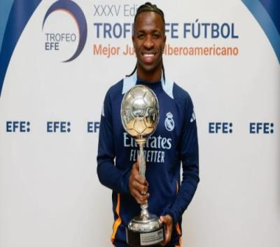 这是维尼修斯连续第3次当选伊比利亚美洲最佳球员,他今年随皇马赢得了西甲冠军和欧冠冠军,个人打进32球。