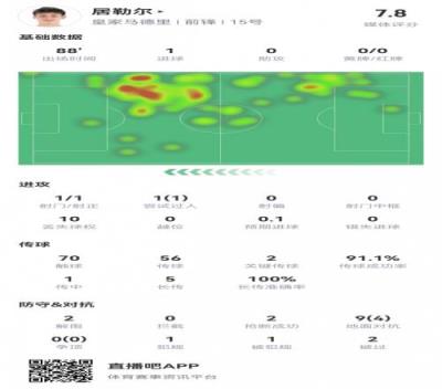 拼尽全力!居勒尔数据:1射1正1粒进球,2次关键传球,评分7.8