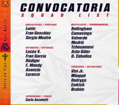 体育资讯1月15日报道宣称 北京时间1月17日凌晨4:30,西班牙国王杯1/8决赛,皇马将坐镇伯纳乌球场迎战塞尔塔。赛前,皇马官方公布了本场比赛球队大名单,库尔图瓦缺席,姆巴佩&维尼修斯领衔锋线。