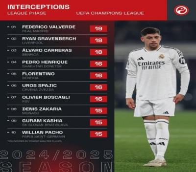 本赛季欧冠拦截榜:巴尔韦德居首,赫拉芬贝赫、A费在列