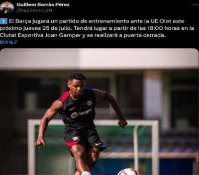 该记者写道:“巴萨将在周四和UE Olot进行训练赛。比赛将在下午6点(北京时间24点)在Ciutat Esportiva Joan Gamper进行,这将是一场闭门训练赛。”