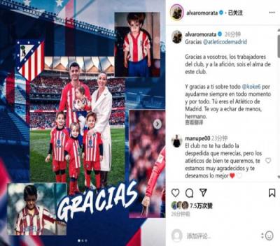 莫拉塔在社媒配文写道:“感谢马竞俱乐部,也感谢球队的工作人员,感谢马竞球迷们,你们是俱乐部的灵魂。特别要感谢科克一直以来对我的帮助,你是马竞的象征,我会想你的,我的兄弟。”