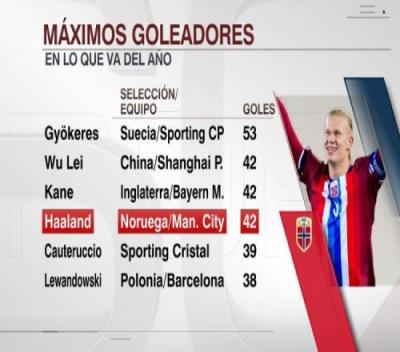 据ESPN统计,2024年哈兰德在国家队和俱乐部比赛中打进42球,排名2024年进球榜并列第二位。