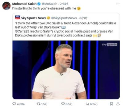 卡拉格解读萨拉赫社媒,萨拉赫转发:我开始觉得你迷上我了