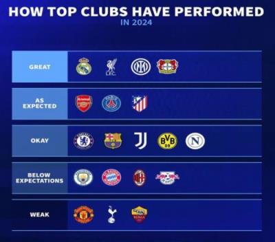 体育资讯12月29日报道宣称 2024年临近尾声,《转会市场》也为多家顶级俱乐部的2024年表现进行了分档评级。