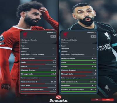 体育资讯1月1日报道宣称 Squawka统计了萨拉赫上赛季、本赛季在英超每90分钟的数据,并作出对比,他上赛季英超每90分钟参与1.1球,本赛季每90分钟参与1.8球。