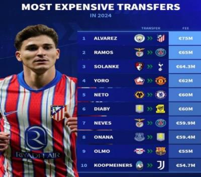 体育资讯12月30日报道宣称 2024年临近尾声,《转会市场》也统计了今年的转会费最贵榜,阿尔瓦雷斯以7500万欧转会费居首。