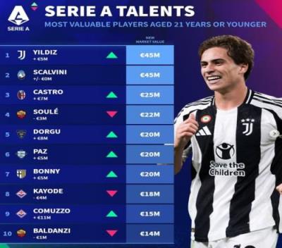 体育资讯12月18日报道宣称 《转会市场》今日更新了意甲球员身价,并列出了21岁及以下球员身价榜,伊尔迪兹&斯卡尔维尼并列居首。