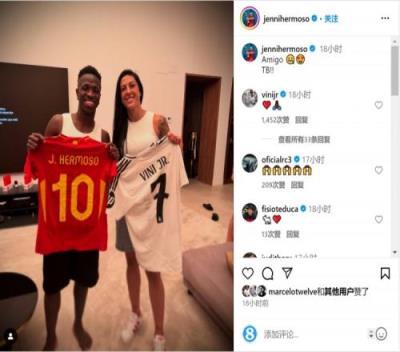 体育资讯12月19日报道宣称 西班牙女足前锋珍妮弗-埃尔莫索更新社媒动态,晒出与维尼修斯交换球衣的照片。