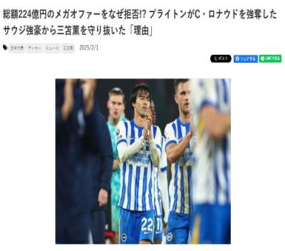 日媒:沙特合计224亿日元报价三笘薰被拒,日本球员正被世界认可