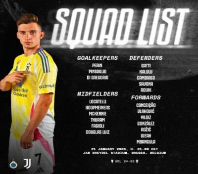 体育资讯1月20日报道宣称 北京时间1月22日凌晨4:00,欧冠联赛阶段第7轮,尤文图斯将客战布鲁日。赛前,尤文官方公布了本场比赛球队大名单,弗拉霍维奇领衔锋线,小孔塞桑在列。