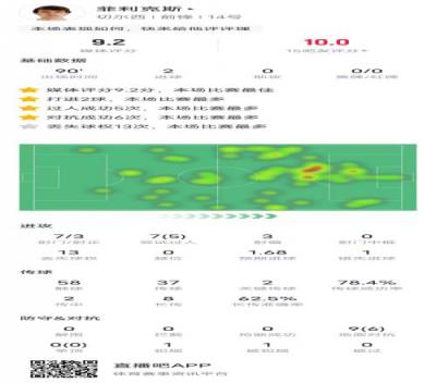 菲利克斯本场数据:2进球5过人成功2关键传球,评分9.2全场最高