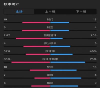 利物浦22曼联全场:射门1913,控球率55开,预期进球2.871.03