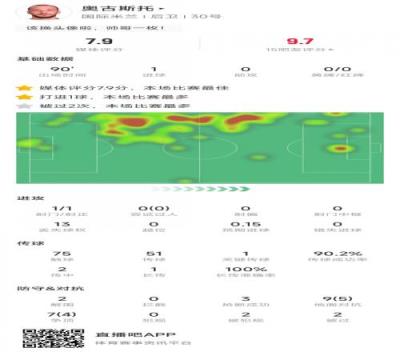 奥古斯托数据:1次射门取得进球,传球成功率90.2%&7.9分全场最高
