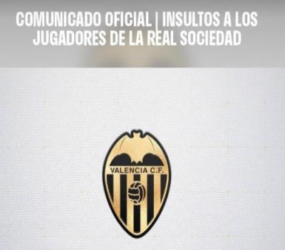 瓦伦西亚足球俱乐部希望公开表明立场,坚决谴责上周日在梅斯塔利亚球场进行的比赛中,一些皇家社会球员在场边进行热身时遭受的辱骂。