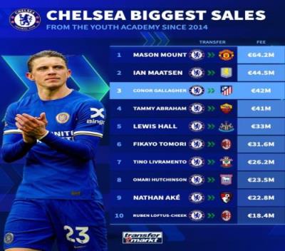 蓝军出售青训球员价格榜:芒特6420万欧居首,加拉格尔4200万第三