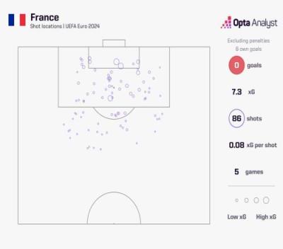 法国队也是自有记录以来,欧洲杯首支超过50次非点球射门而没能取得1粒进球的球队。