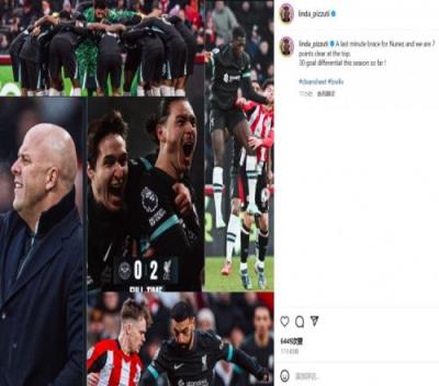 利物浦老板娘琳达更新了社媒,庆祝胜利:“努涅斯最后时刻的梅开二度让我们7分领跑,本赛季到目前为止英超净胜球30个!”
