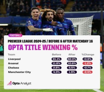 体育资讯12月16日报道宣称 英超第16轮结束,opta更新了超算计算的英超夺冠概率,在两连平后,利物浦的夺冠概率仍高达82%,切尔西多赛一场落后红军两分,但夺冠概率仅为5.5%。