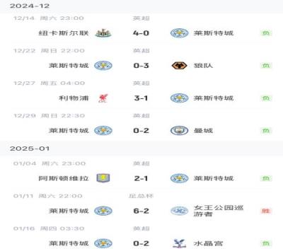 体育资讯01月16日报道宣称 莱斯特城本轮0-2不敌水晶宫,莱斯特城最近6场英超比赛全败。