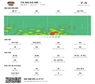 马兹拉维本场数据:6次成功对抗,传球成功率92%,评分7.4