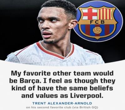 当时,阿诺德接受了英国《GQ》杂志的采访,他说道:“我最喜欢的另外一支球队是巴萨,我感觉他们是一家和利物浦有着相同信念和价值观的俱乐部。”