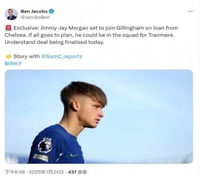 雅各布斯指出,切尔西小将摩根将租借加盟英乙俱乐部吉灵汉姆,如果一切顺利,他可能进入对阵特兰米尔的大名单,各方今天敲定这笔交易。