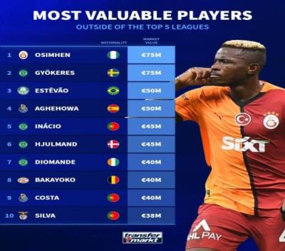 非五大联赛球员身价榜:葡体4人上榜,奥斯梅恩&约克雷斯居首