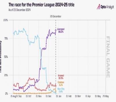 OPTA通过大数据预测显示,红军本赛季夺冠希望很大。而卫冕冠军曼城从赛季初的接近80%夺冠概率已经几乎归零。