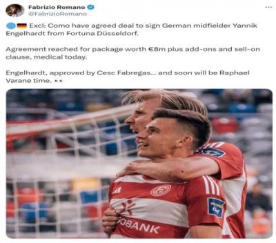 罗马诺指出,科莫有意在今夏引进恩格尔哈特,这笔交易已经达成协议,转会费800万欧加浮动,协议中将包含转售分成条款,球员将在今天接受体检。恩格尔哈特的交易得到了法布雷加斯的认可,接下来科莫将很快免签瓦拉内。