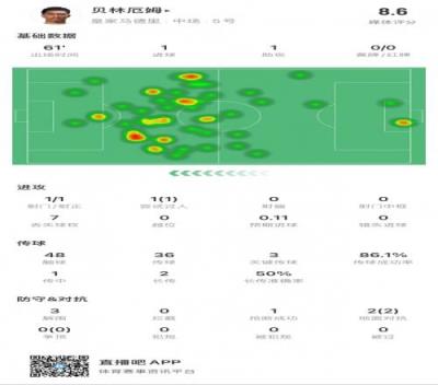 贝林厄姆本场数据:1球1助,3次关键传球,3次解围