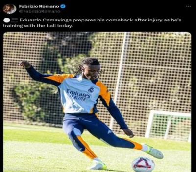 罗马诺:卡马文加已经恢复有球训练,正在准备复出