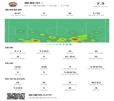 体育资讯12月21日报道宣称 拜仁在本轮德甲3-1领衔莱比锡,莱默尔本场数据如下: