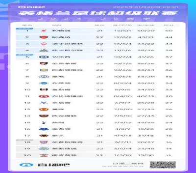 英超积分榜:森林44分追平阿森纳曼联第13热刺第15圣徒6分垫底