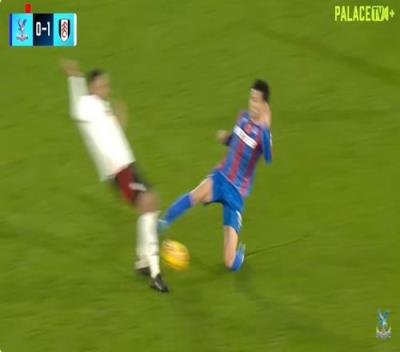 比赛第76分钟,水晶宫0-1落后,镰田大地在一次拼抢中选择高抬腿飞身铲球,尽管在最后时刻镰田大地有一个收脚动作,但还是蹬到了富勒姆后卫泰特的小腿上,当值主裁随即出示红牌将镰田大地罚下。